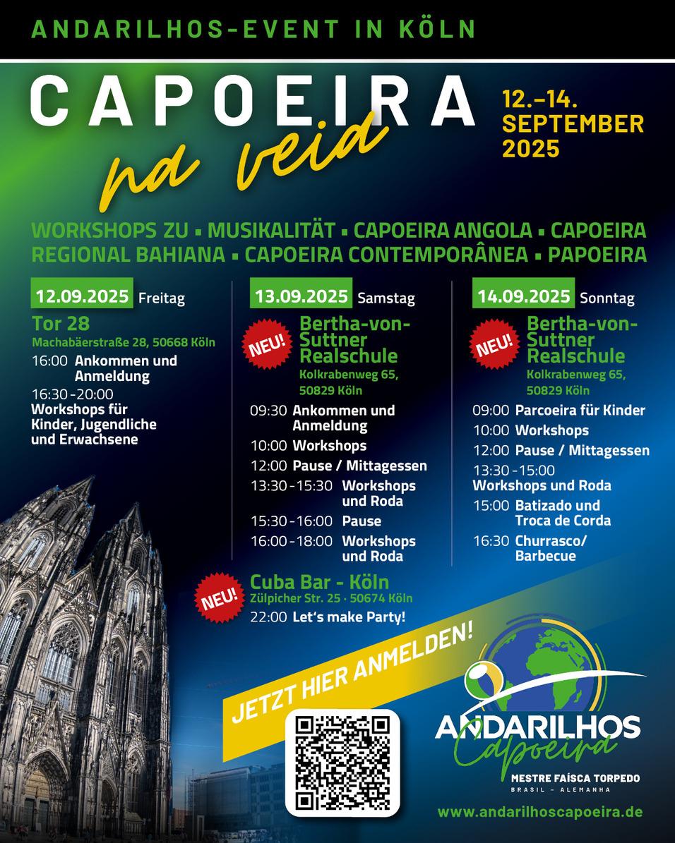 Neu und anders findet unser eigentliches Capoeira-Camp dieses Jahr Zuhause in Köln statt. Intensiv wie unser Camp, aber in Form eines "Wochenend-Seminars" werden wir den verschiedenen Capoeira-Stilen begegnen und uns mit diesen eingehend auseinandersetzen.